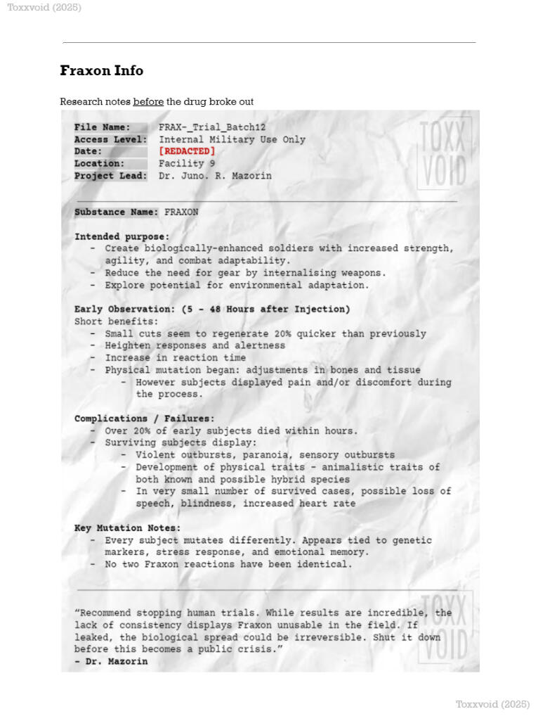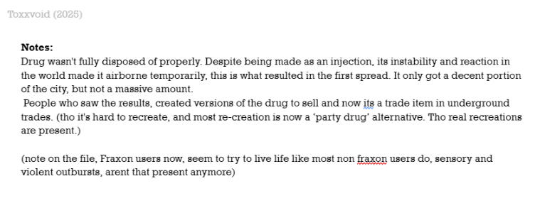 Drugs: The world is built on an event surrounding a failed drug (there is also a made up file that talks about the Drug)Death: Death is mentionedGangs: Underground groups are prominentControl & Corruption