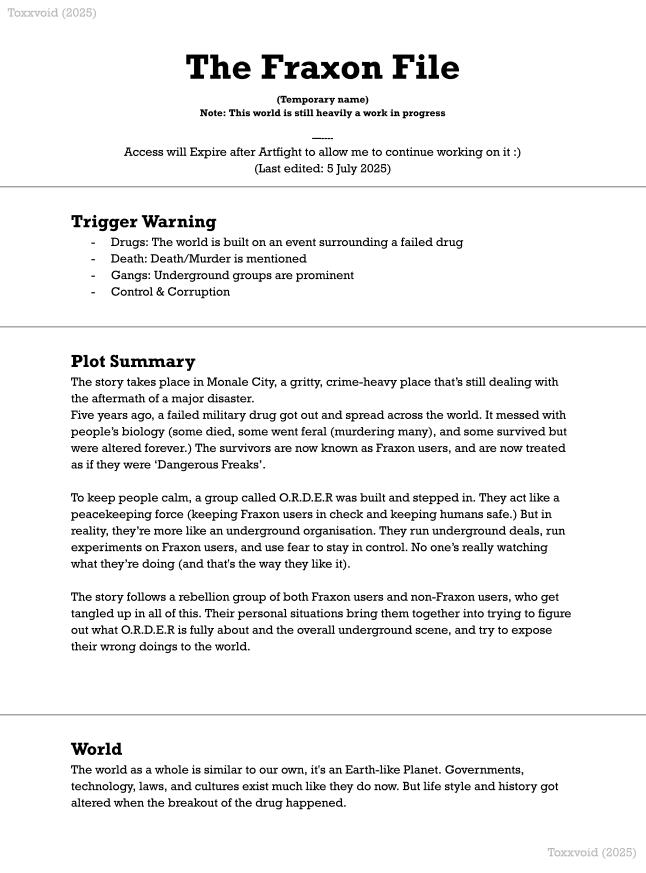 (everything is screenshoted, from my own personal Doc)this will be discarded after artfight, as i will continue to work on the story!